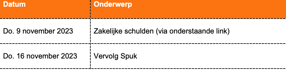 Tijdens dit vragenuur kunt u praktische vragen stellen over hoe u invulling geeft aan deze regeling binnen de eigen gemeente en schuldhulpverleningsorganisatie. Opgeven kan via dit formulier. Na uw aanmelding ontvangt u een link naar het betreffende vragenuur. |