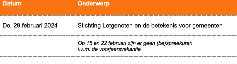 Tijdens het (be)spreekuur kunt u onderling best practices delen of andere gemeenten om advies vragen. De agenda kan wijzigen naar aanleiding van actualiteiten.
