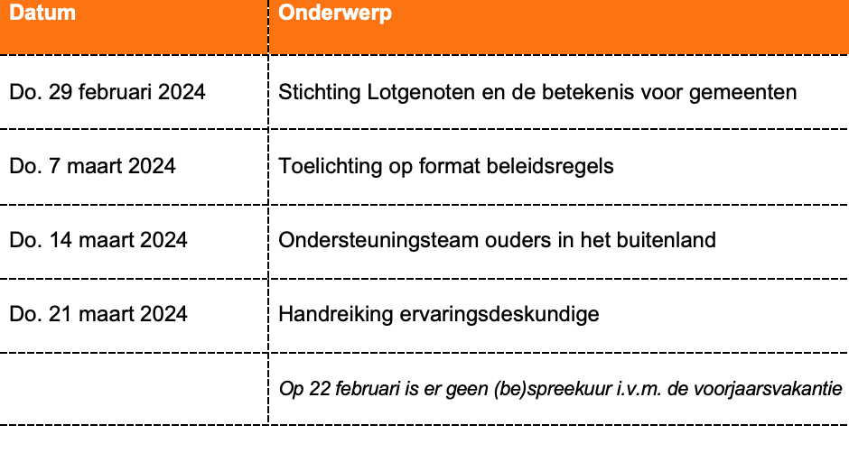 Tijdens het (be)spreekuur kunt u onderling best practices delen of andere gemeenten om advies vragen. De agenda kan wijzigen naar aanleiding van actualiteiten.