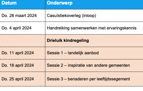 Tijdens het (be)spreekuur kunt u onderling best practices delen of andere gemeenten om advies vragen. De agenda kan wijzigen naar aanleiding van actualiteiten.