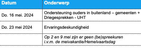 Tijdens het (be)spreekuur kunt u onderling best practices delen of andere gemeenten om advies vragen. De agenda kan wijzigen naar aanleiding van actualiteiten.