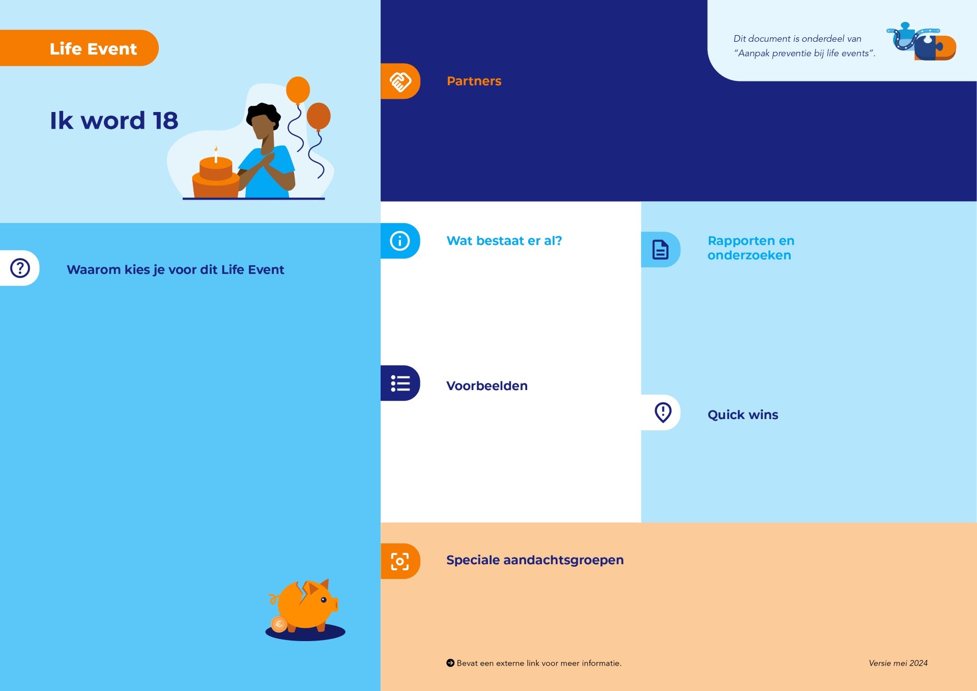 Er worden 16 actiekaarten ontwikkeld voor gemeenten die actief aan de slag willen met preventie van schulden bij life events. De kaarten worden de komende maanden per set van 2 life events beschikbaar gesteld. Hiermee hebben gemeenten in één oogopslag alle relevante informatie per life event bij elkaar. De eerste twee actiekaarten ‘ik word 18’ en ‘wij gaan uit elkaar’ zijn bijna klaar. Houd de volgende nieuwsbrief in de gaten.