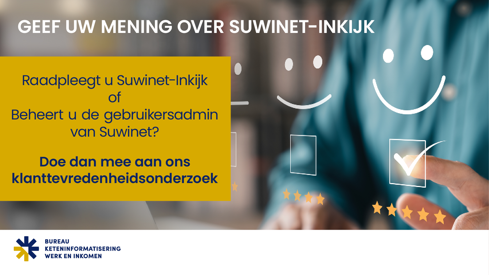 BKWI vraagt uw mening over Suwinet-InkijkGebruikt u Suwinet-Inkijk of beheert u de gebruikersadministratie van Suwinet? Dan is BKWI op zoek naar uw mening. Wat gaat volgens u goed en wat kan beter? Deel uw ervaring met BKWI in het Klanttevredenheidsonderzoek zodat Suwinet-Inkijk blijft aansluiten op uw wensen.