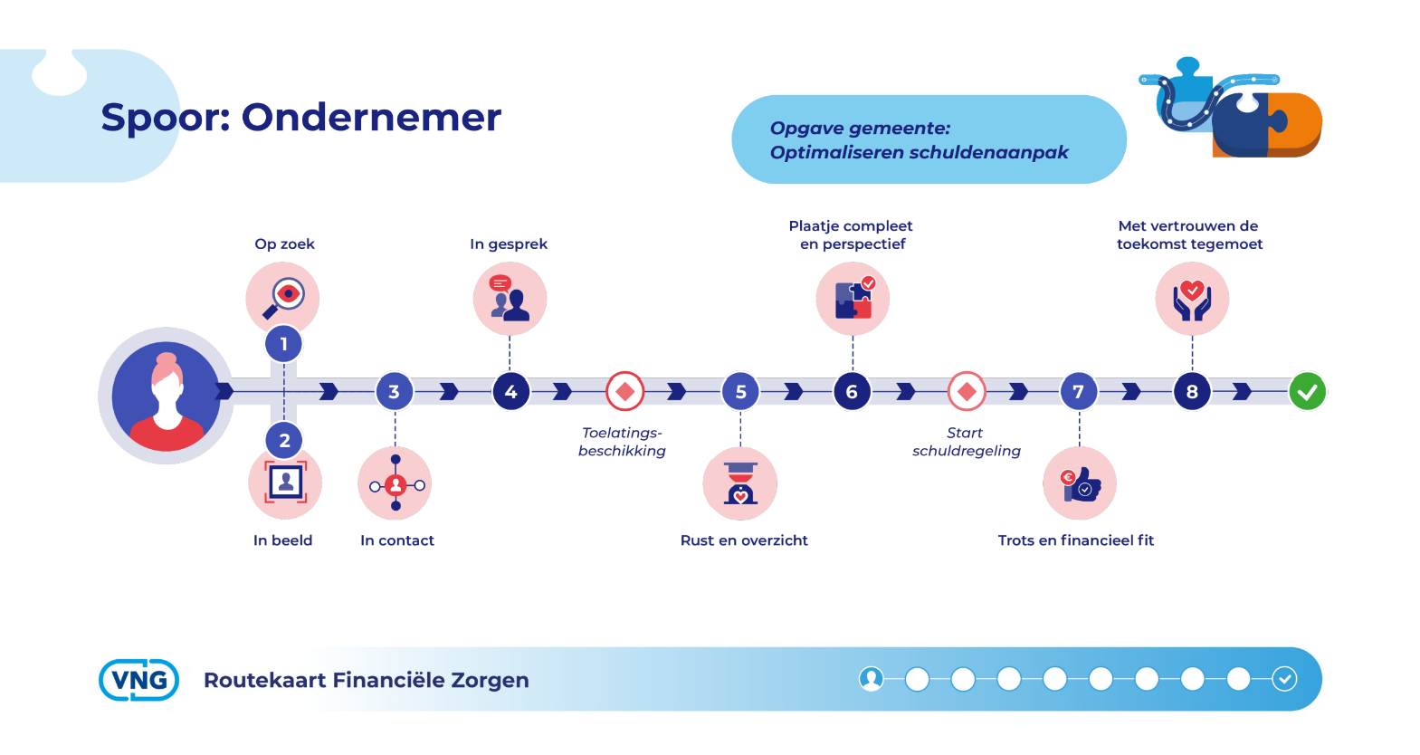 Publicatie Spoor van de ondernemer op de routekaart Financiële Zorgen Op 23 september wordt het Spoor van de ondernemer gepubliceerd op de routekaart Financiële Zorgen. Gemeenten krijgen via dit spoor concrete handvatten, ondersteuning en voorbeelden van effectieve interventies aangeboden. Aan de hand daarvan kunnen zij hun dienstverlening aan ondernemers met financiële zorgen inrichten of versterken. Het Spoor van de ondernemer is gebaseerd op de ideale reis van ondernemers en biedt een basis voor de uitvoering van preventie, vroegsignalering, regelen van schulden, begeleiding en nazorg. Daarbij is er niet alleen aandacht voor de rol van de schuldhulpverlener, maar ook voor de beleidsmedewerker, jurist, communicatieadviseur en informatiekundige.