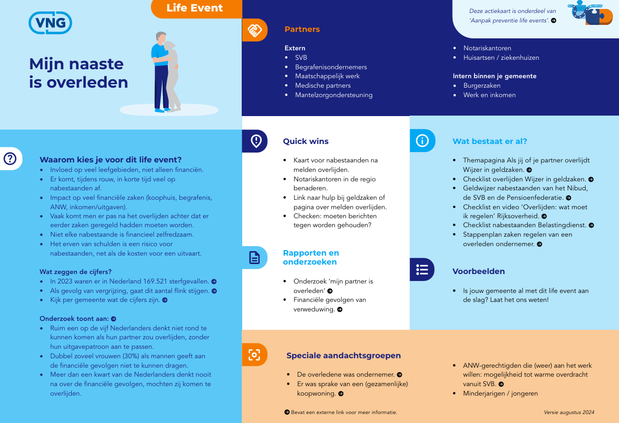Nieuwe actiekaarten: ‘Ik ga met pensioen’ en ‘Mijn naaste is overleden’ Steeds meer gemeenten willen actiever aan de slag met preventie van schulden bij life events. VNG maakt voor 16 life events actiekaarten. Op handzaam formaat en met praktische informatie voor gemeenten. Om direct nog actiever aan de slag te kunnen met het ondersteunen van inwoners bij het voorkomen van schulden, door gericht in te spelen op life events. De actiekaarten ‘Ik ga met pensioen’ en ‘Mijn naaste is overleden zijn nu beschikbaar. Eerder verschenen al de actiekaarten ‘Ik word 18’, ‘Wij gaan uit elkaar’, ‘Ik krijg een kind’ en ‘Ik word werkloos’. |