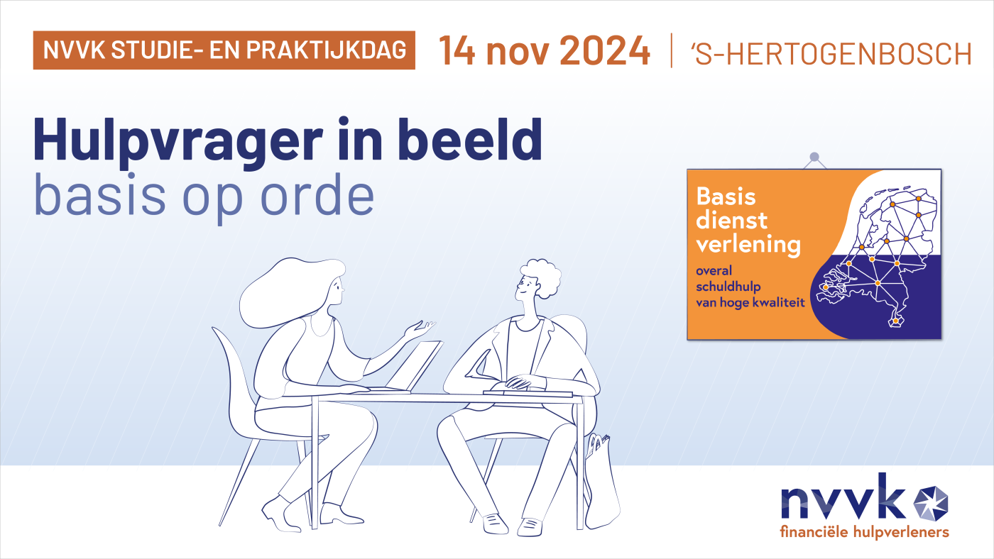 NVVK organiseert studie- en praktijkdag ‘Hulpvrager in beeld, basis op orde’De NVVK Studiedag (donderdag 14 november in ’s Hertogenbosch) opent met aandacht voor praktische toepassingen van AI in de uitvoering van het werk van financiële hulpverleners. Daarna zijn er 4 rondes van workshops en werkbezoeken. De studie- en praktijkdag biedt onder andere workshops waarmee ze de basisdienstverlening schuldhulpverlening verder invullen. Een programma ‘met de voeten in de klei, gereedschap onder handbereik en gericht op resultaat’.