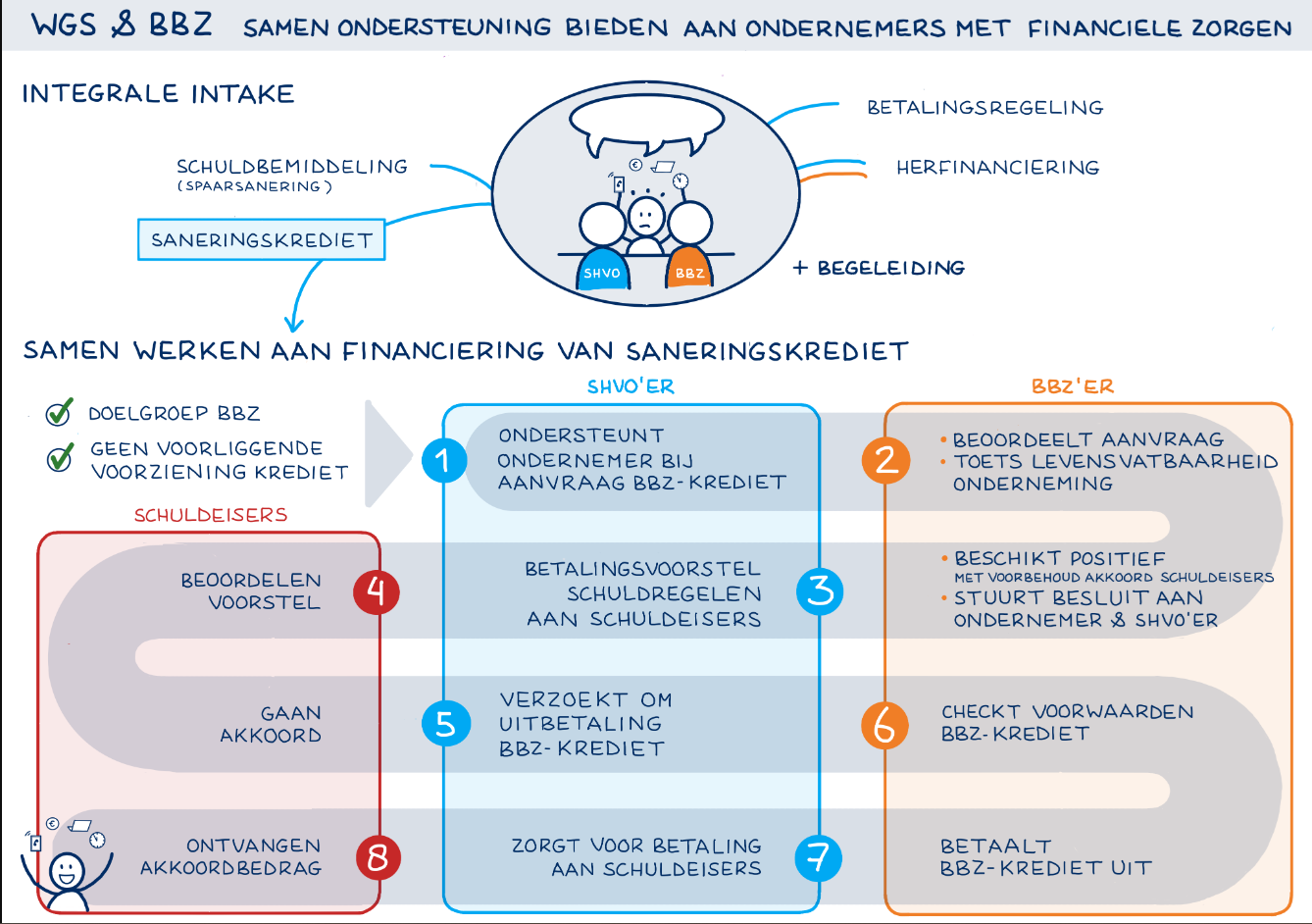 Wgs & Bbz | samen ondersteuning bieden aan ondernemers met financiële zorgenOndernemers met financiële zorgen zijn gebaat bij een nauwe samenwerking tussen de afdeling schuldhulpverlening en de collega's die het Bbz uitvoeren. Een nieuwe tekening verduidelijkt de integrale intake en de samenwerking tussen Wgs en Bbz bij de financiering van een saneringskrediet vanuit het Bbz. U vindt de tekening hier. |