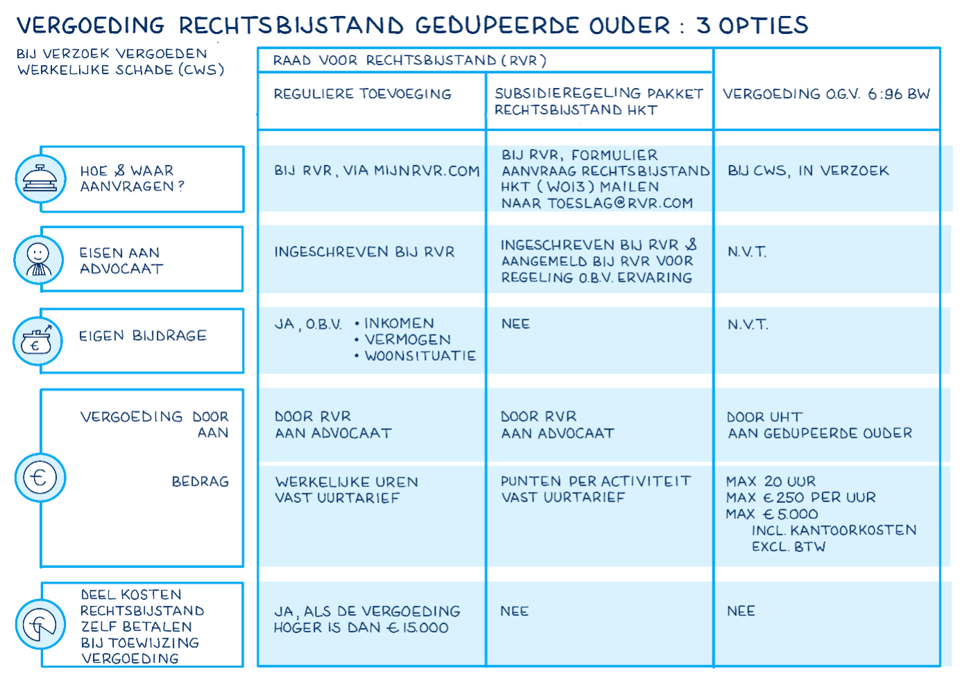 Oordeelt de CWS dat de schade inderdaad hoger is? Dan adviseert de commissie aan UHT om een aanvullende schadevergoeding uit te betalen. Ouders kunnen zich bij dit proces laten bijstaan door een advocaat. De vergoeding voor deze rechtsbijstand kan op 3 manieren worden geregeld. |