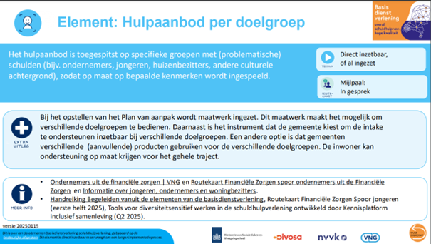 In de handreiking Het begeleiden van inwoners staan tips voor het begeleiden van drie doelgroepen. Zo is het bijvoorbeeld bij ondernemers belangrijk dat u zichtbaar begrijpt hoe moeilijk de situatie is. Bij jongeren dat u hen actief blijft betrekken bij het traject en aandacht besteedt aan andere problemen in hun leven. En voor inwoners met een andere sociaal-culturele achtergrond dat u voldoende kennis heeft over verschillende culturen.Meer informatie over het element Hulpaanbod per doelgroep.