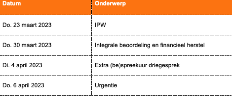 Tijdens het (be)spreekuur kunt u onderling best practices delen of andere gemeenten om advies te vragen. De agenda kan wijzigen naar aanleiding van actualiteiten. |