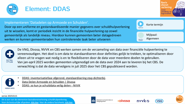 NVVK: ‘Werken met DDAS is voor ons een besparing'De gemeente Doetinchem ziet de meerwaarde van het grensverleggende DDAS-project: eindelijk betrouwbare, eenduidige cijfers over financiële hulp, waardoor gemeenten zich bijvoorbeeld goed onderling kunnen vergelijken. Het vraagt om investering in een softwaremodule, maar daar staat een grotere besparing op handwerk tegenover. Data Delen Armoede en Schulden (DDAS) is een van de elementen van de Basisdienstverlening Schuldhulpverlening. | | Kijk voor informatie op de website |