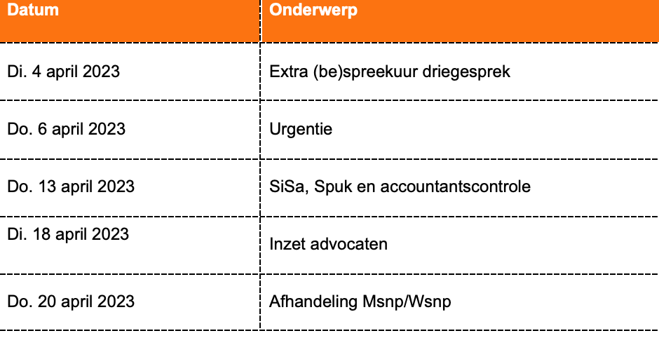 De onderwerpen van onze (be)spreekuren worden vastgesteld aan de hand van thema’s die op dit moment spelen of actualiteiten rond de hersteloperatie. Ook organiseren wij (be)spreekuren over onderwerpen waar gemeenten regelmatig vragen over stellen. Denk hierbij aan de samenwerking tussen gemeenten en de Belastingdienst of de rol van de Persoonlijk Zaakbehandelaar.