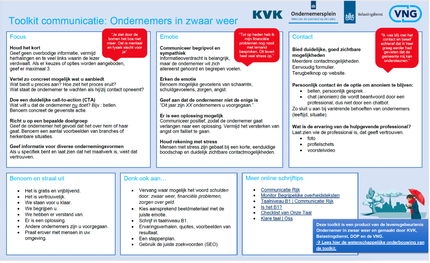 Vernieuwde Toolkit voor effectievere communicatie met ondernemers Ondernemers met financiële zorgen trekken niet snel aan de bel bij hun gemeente. De Toolkit communicatie met ondernemers in zwaar weer | VNG helpt (overheids)organisaties om zo te communiceren, dat ondernemers wél die stap zetten. Onlangs is deze toolkit voorzien van een voorbeeld van een gemeentelijke webpagina op B1-niveau. De toolkit is gebaseerd op wetenschappelijke inzichten over gedragsverandering bij ondernemers en kwam tot stand in samenwerking met o.a. prof. Jan Adriaanse. Tijdens het NVVK-congres op 15 mei verzorgt prof. Adriaanse een interessante workshop over de fasen van het rouwproces van ondernemers als het slecht gaat met de onderneming. Deelnemers krijgen tips om succesvol aan te sluiten bij de situatie waarin de ondernemer zit en oefenen om hun aanpak af te stemmen op de ondernemer. |