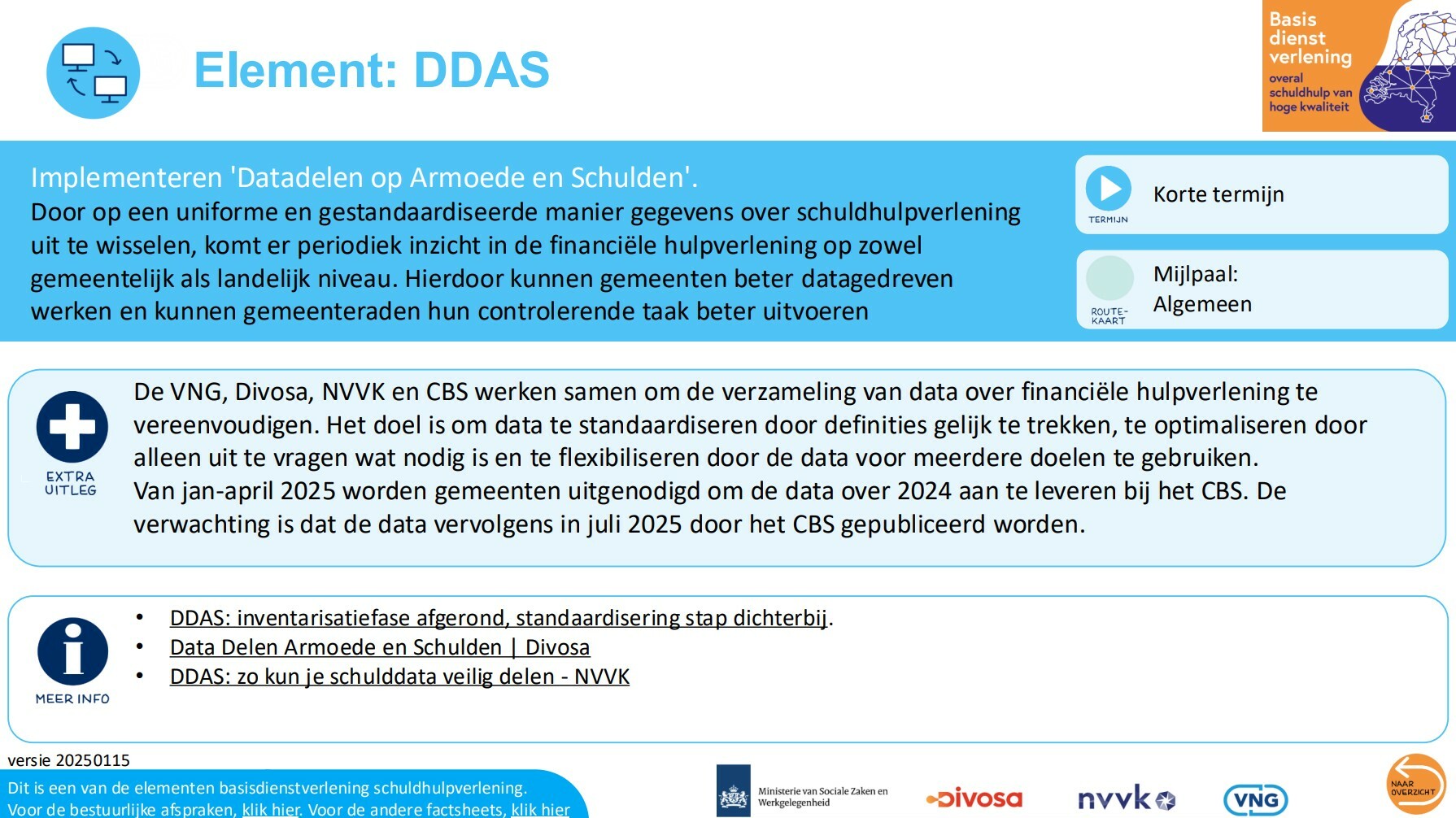 'Werken met DDAS is voor ons een besparing' De gemeente Doetinchem ziet de meerwaarde van het grensverleggende DDAS-project: eindelijk betrouwbare, eenduidige cijfers over financiële hulp, waardoor gemeenten zich bijvoorbeeld goed onderling kunnen vergelijken. 'Het vraagt om investering in een softwaremodule, maar daar staat een grotere besparing op handwerk tegenover.' Lees het praktijkverhaal van de gemeente Doetinchem op de website van NVVK.