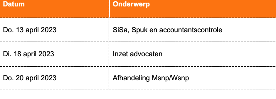 De onderwerpen van onze (be)spreekuren worden vastgesteld aan de hand van thema’s die op dit moment spelen of actualiteiten rond de hersteloperatie. Ook organiseren wij (be)spreekuren over onderwerpen waar gemeenten regelmatig vragen over stellen. Denk hierbij aan de samenwerking tussen gemeenten en de Belastingdienst of de rol van de Persoonlijk Zaakbehandelaar.