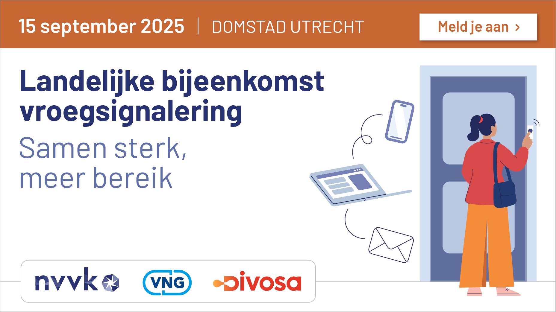 Op 15 september 2025 organiseren VNG, Divosa en NVVK de Landelijke bijeenkomst Vroegsignalering. Het programma start dit jaar om 10.30 uur en duurt tot ongeveer 16.30 uur. Met dit langere programma is er extra veel ruimte voor ontmoeten, kennisdelen en verbinden. De dag staat in het teken van: Samen sterk, meer bereik. Zet de datum alvast in de agenda. Meld u hier aan.