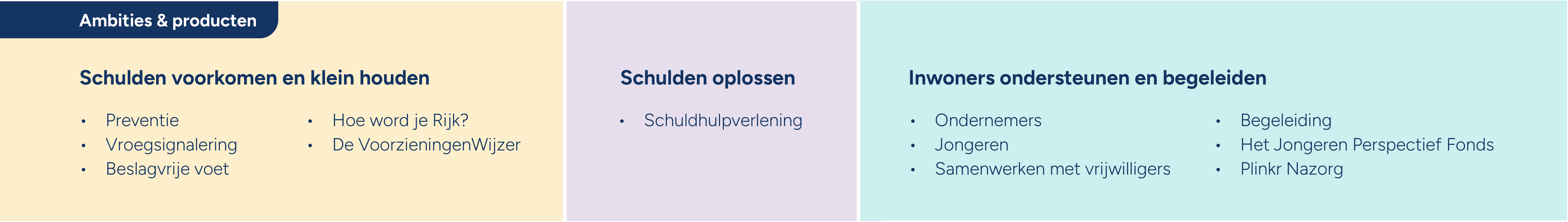 Gemeenten werken, samen met ketenpartners, aan het voorkomen en terugdringen van schulden bij inwoners. Gemeenten staan dichtbij inwoners als direct bereikbare en zichtbare overheid. De VNG ondersteunt gemeenten met handvatten en praktische voorbeelden in hun rol en ambities rond het voorkomen en klein houden van schulden, het oplossen van schulden en het ondersteunen en begeleiden van inwoners met financiële zorgen of schulden. Ook biedt de VNG gemeenten de mogelijkheid elkaar te vinden en met elkaar te bouwen aan een integrale aanpak van schulden waarin de inwoner centraal staat. De afgelopen drie jaar bouwden we aan het schuldendomein vanuit het subsidieprogramma Verbinden Schuldendomein. De komende periode bouwen we vanuit de reguliere organisatie van de VNG verder aan een toekomst zonder schulden. |
